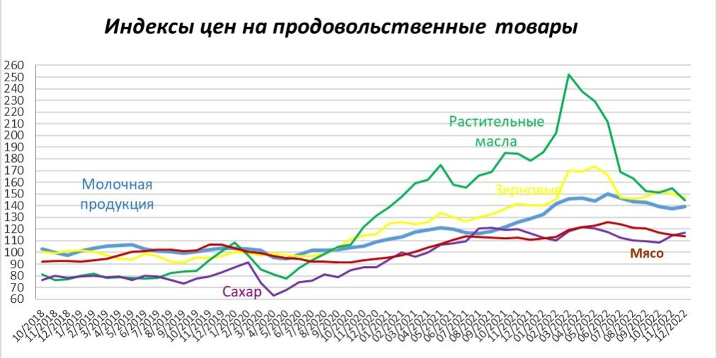В декабре 2022 года среднее значение Индекса продовольственных цен ФАО* (ИПЦФ) составило 132,4 пункта, что на 2,6 пункта (1,9 процента) ниже показателя ноября; такое падение продолжается уже девять месяцев – показатель индекса был на 1,3 пункта (1,0 процента) ниже показателя за тот же период прошлого года. Это снижение индекса с декабре было обусловлено резким падением мировых цен на растительные масла наряду с некоторым снижением цен на зерновые и мясо; однако эти процессы были частично уравновешены умеренным ростом цен на сахар и молочную продукцию. По итогам 2022 года среднее значение ИПЦФ составило 143,7 пункта, что на целых 18 пунктов (14,3 процента) выше показателя 2021 года.