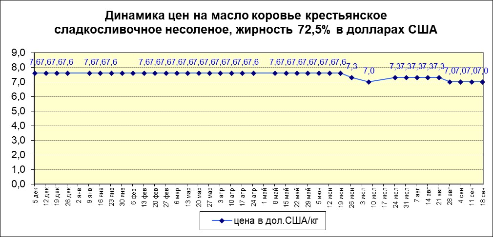 Держится цена на масло коровье сладкосливочное несоленое, жирность 72,5% , таким образом, минимальная цена сравнялась с максимальной ценой и установилась на уровне –7,0 долларов США. Показатель в рублях отсутствует.