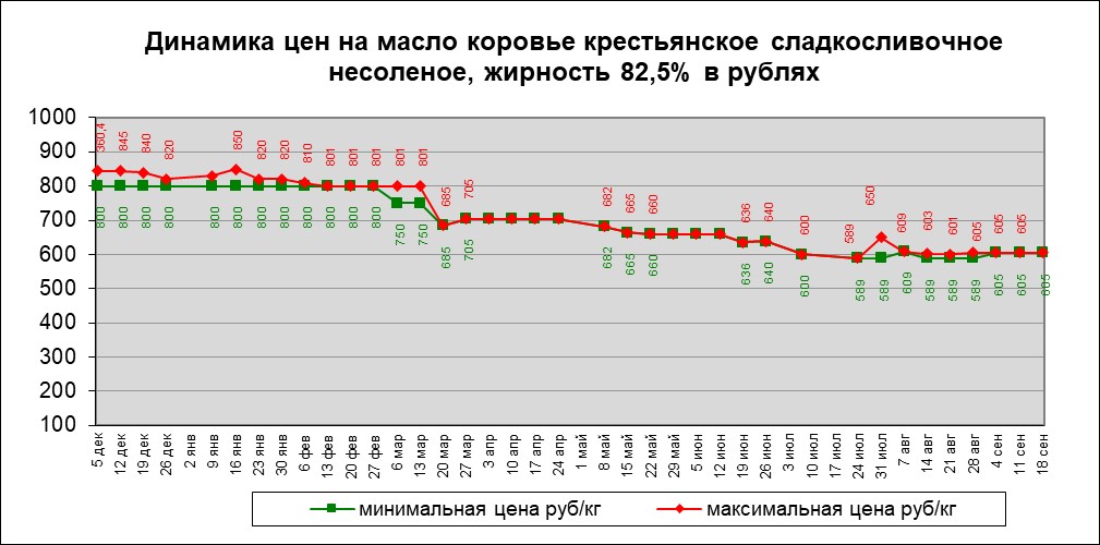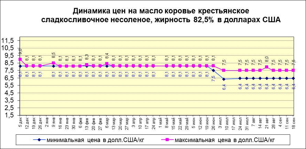 Не было изменений в цене на масло коровье сладкосливочное несоленое, жирность 82,5%, таким образом, минимальная цена равна —6,4 долларам США за килограмм, максимальная цена равна —7,5 долларам США за килограмм. Держится цена показателя в рублях, таким образом, минимальная цена сравнялась с максимальной ценой и установилась на уровне – 605 рублей за килограмм.