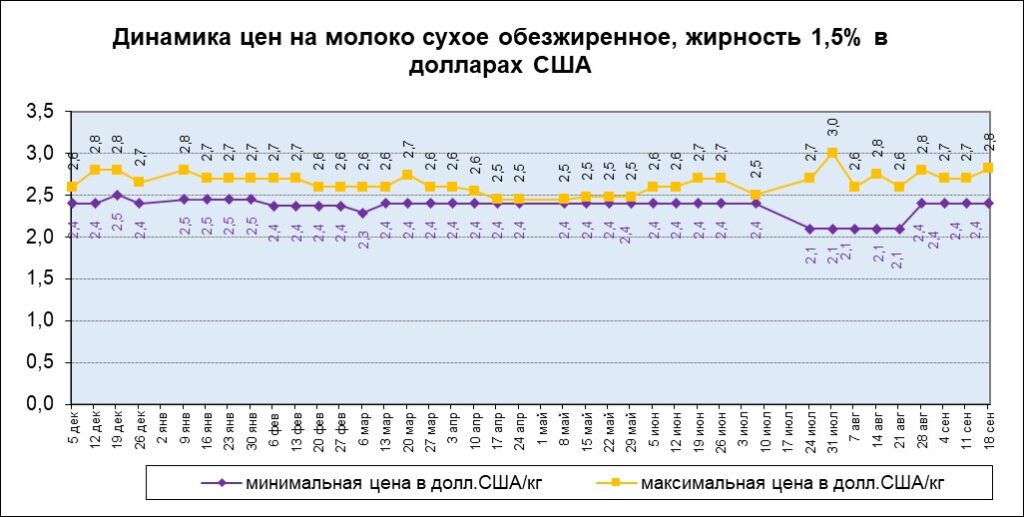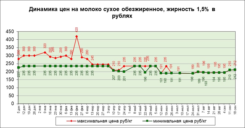 Были колебания в цене на молоко сухое обезжиренное, жирность 1,5%, таким образом, минимальная цена равна —2,4 долларам за килограмм, максимальная цена выросла на 4,4% и равна -2,8 долларам США за килограмм. Минимальная цена в рублях выросла на 1% и сравнялась с максимальной ценой установившись на уровне – 212 рублей за килограмм.