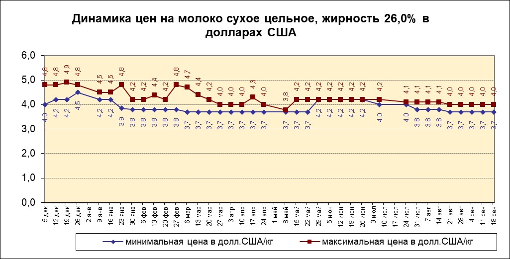 Стабильна цена на молоко сухое цельное, жирность 26,0%, таким образом, минимальная цена равна —3,7 долларам за килограмм, максимальная цена равна -4 долларам США за килограмм. Показатель в рублях отсутствует.