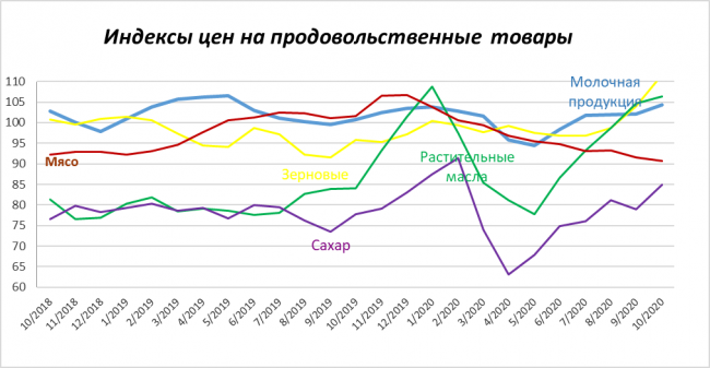 Индекс продовольственных цен ФАО – это показатель изменения за месяц международных цен на корзину продовольственных сырьевых товаров. В октябре 2020 года среднее значение Индекса продовольственных цен ФАО* (ИПЦФ) составило 100,9 пункта, что на 3,0 пункта (3,1 процента) выше сентябрьского значения и на 5,7 пункта (6,0 процента) выше прошлогоднего показателя. В октябре отмечено продолжение роста показателя пятый месяц подряд, который достиг максимального…
